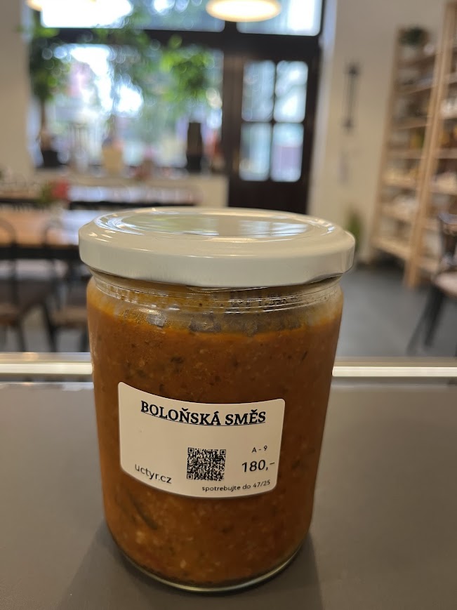 Hovězí- vepřové maso- 50%, cibule, mrkev, celer, rajčatový protlak, rajčata drcená, koření