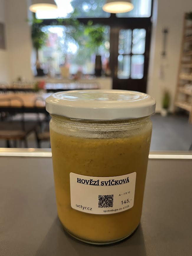 Hovězí maso (150 g syrového masa)-30%, cibule, celer, mrkev, petržel, horčice, cukr, ocet, smetana, koření