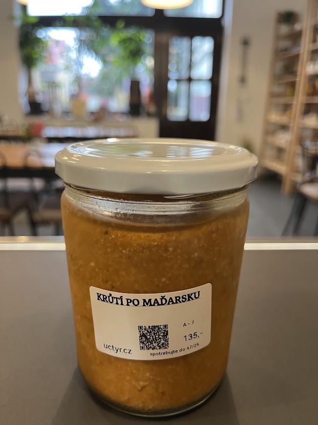 Krůtí maso (150 g syrového masa)-30%, cibule, paprika čerstvá, zakysaná smetana, koření