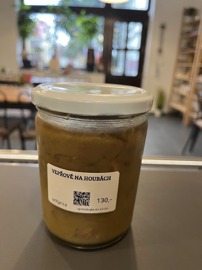 Vepřové maso (150 g syrového masa)-30%, cibule, houby, koření