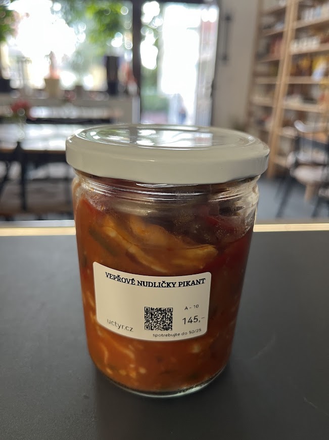 Vepřové maso (150 g syrového masa)-30%, cibule, paprika, fazolky, jalapeňos, kečup, hořčice, chilly omáčka